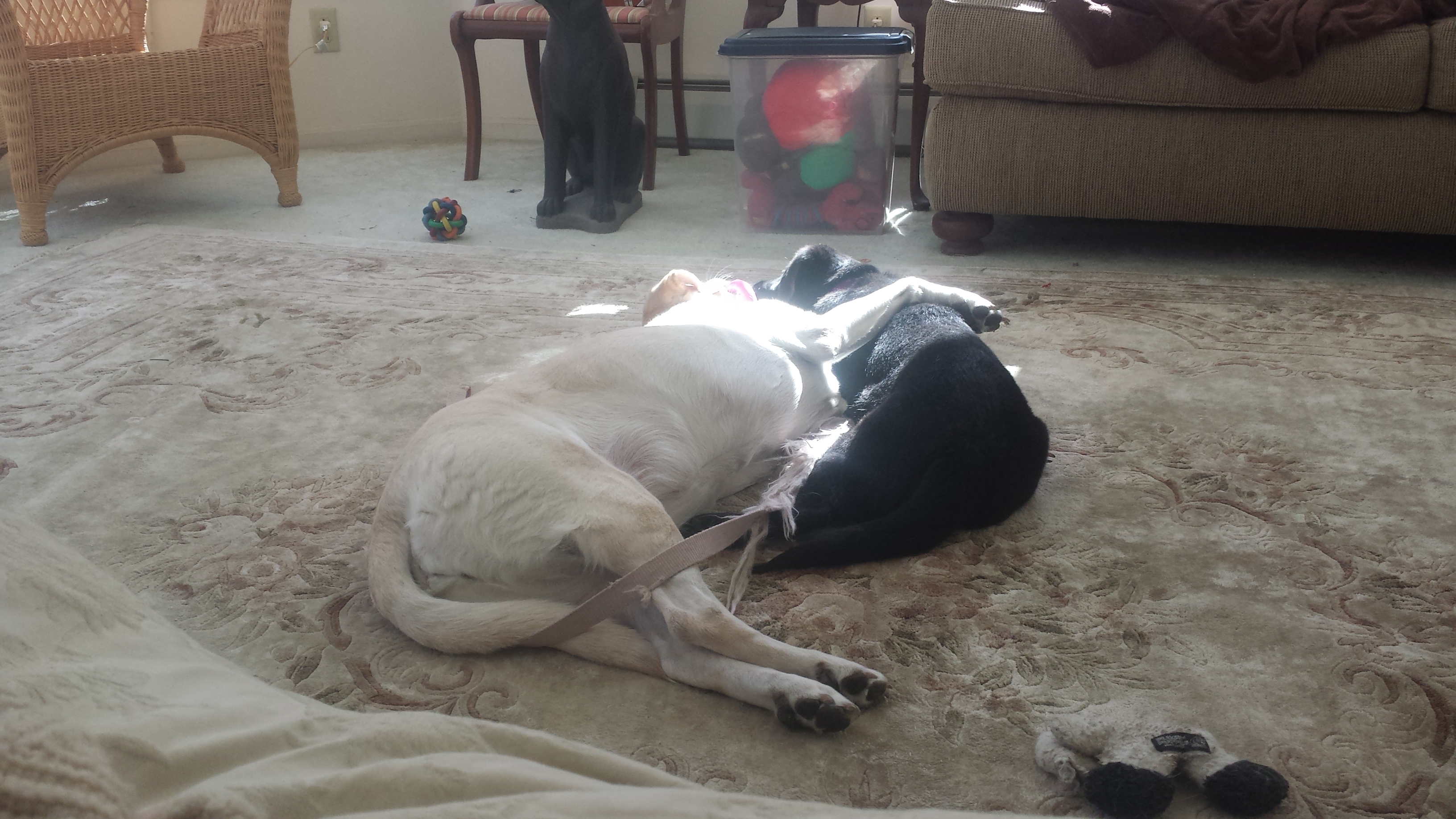 These two were always unseparatable, until his passing. Katie then became depressed until her brother (Maddox) arrived. These two hit things off, never leaving each others side, touching each other, playing together. She shown him what this household is all about, keeping him in line. She taught him all the ins & outs, and became best friends, by sharing her water, food, toys, etc.